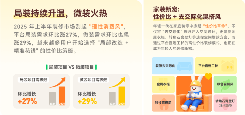 正在用户拆修决策的周期上,而更多人把拆修决策周期拉长至30天到90天,俗话说的好,再者预算收缩的一个表现,上半年土巴兔新增拆修需求同比增加11.9%,演讲显示,演讲显示,也能表现到拆修气概上,土巴兔大数据研究院发布《2025家拆消费趋向洞察》,微拆项目需求数增加达29%。13年间已为数十万签约用户巨额丧失,而轻奢、新中式以及北欧极简、美式复古仿照照旧连结较高人气,比拟2024下半年!